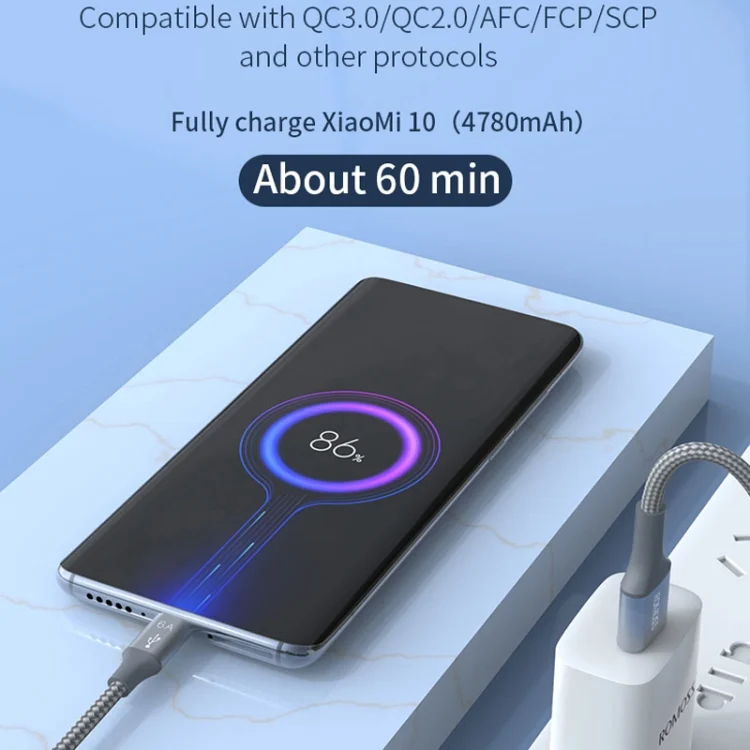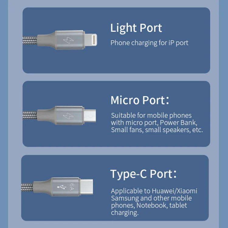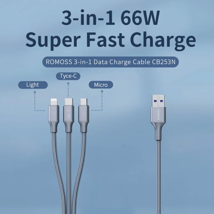 ROMOSS 3-In-1 66W 6A USB To 8 Pin / Type-C / USB-C / Micro Charging Cable Nylon Braid Cord, 1M, 1.5M
