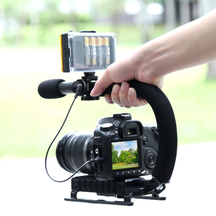 PULUZ U/C Shape Portable Handheld DV Bracket Stabilizer + Video Shotgun Microphone Kit with Cold Shoe Tripod Head for All SLR Cameras and Home DV Camera