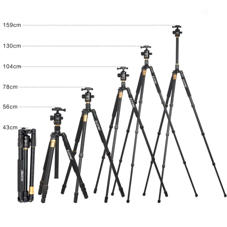 4. ZOMEI Z688 camera tripod has 4 leg sections,fully adjustable legs with stay set manual locking mechanism for fast and easy height adjustments. Max height: 1590mm.