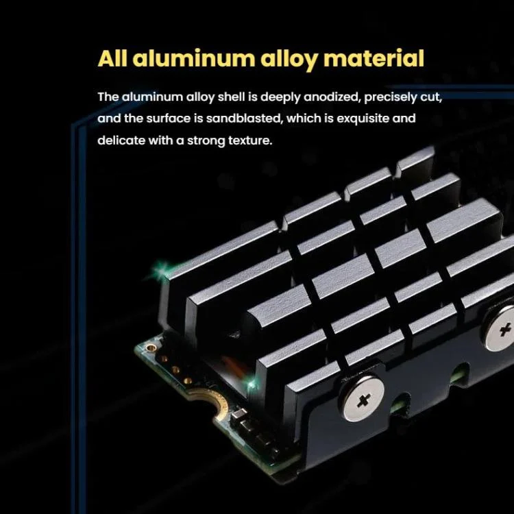 3. The CNC-finished all-aluminum alloy heat sink is equipped with high-efficiency phase-change thermal conductive silicon wafers, which dissipate heat on both sides and effectively suppress the temperature rise of the solid state drive and reduce the performance of the SSD.