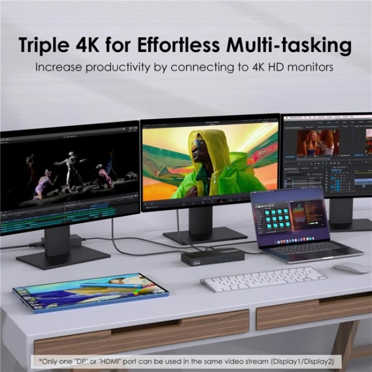 2.Triple 4K@60Hz Display: With five video interfaces (2 DisplayPort + 2 HD + HD (Alt Mode)), you can simultaneously display content on three external monitors, with each screen showing different content, making multitasking a breeze. Supports triple display resolutions up to 3840×2160@60Hz with a DP1.4 source. Note: The HD (Alt Mode) port requires your laptop’s Type-C port to support video output