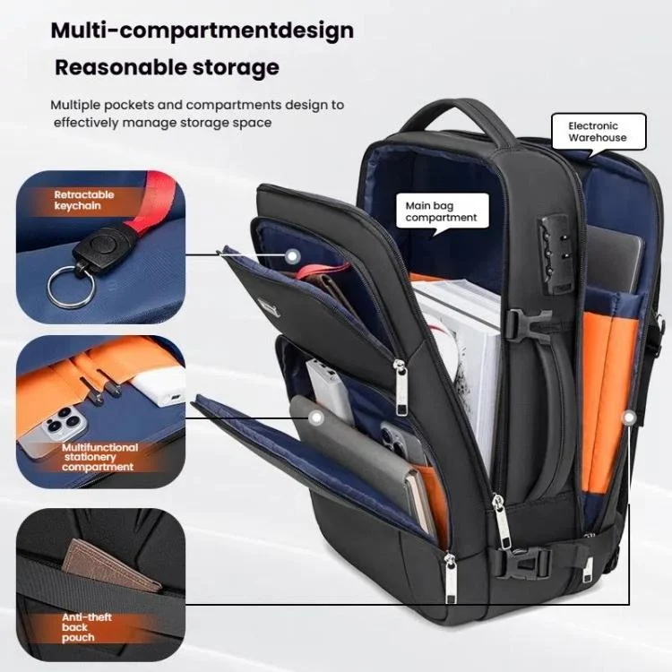 2. Multi-pocket and compartment design: main bag compartment + electronic equipment compartment + front auxiliary pocket + stationery compartment + anti-theft backpack, effectively manage storage space