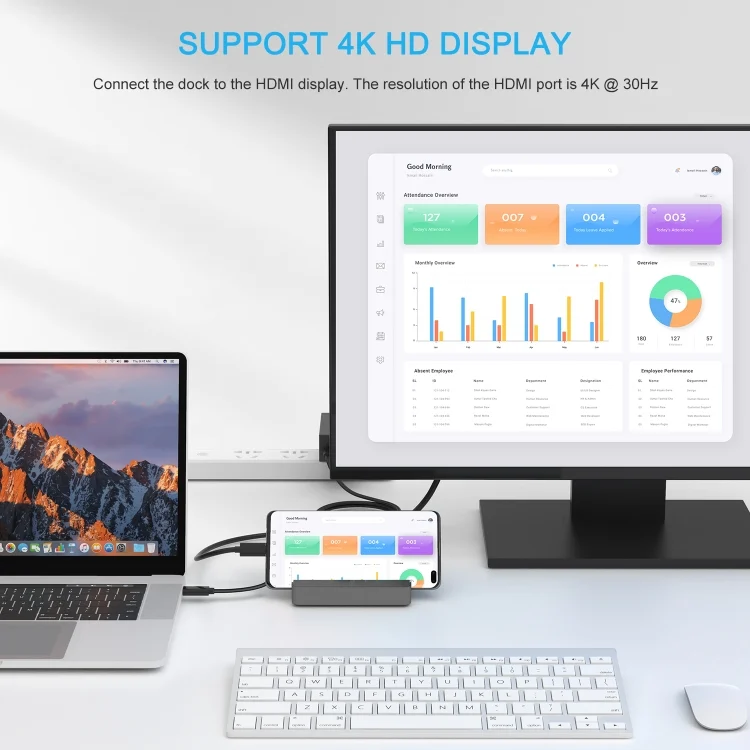 4. One Cable Connection: The dock delivers up to 36W of power via the Power over USB-C standard to charge USB-C laptops while adding HD and extended USB device connectivity, including 2 USB 3.0 Type-A ports, 1 USB 3.1 Gen2 USB-C ports and 1 USB 3.1 Gen1 USB-C port, all via a single USB-C cable (with built-in E-mark chip). The dock can charge your device even if your laptop is turned off or not connected at all