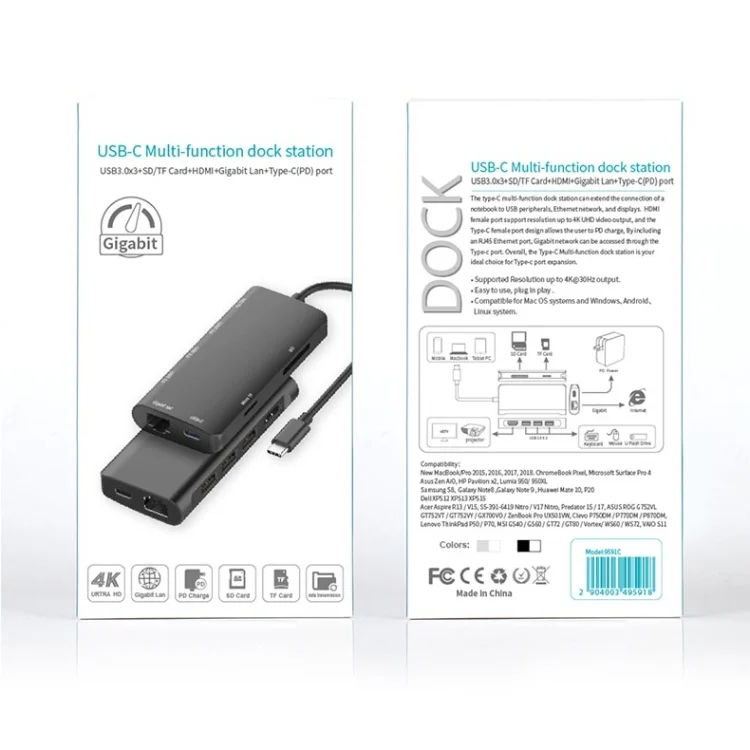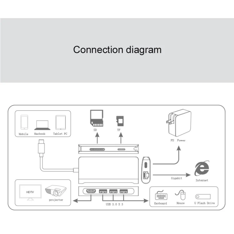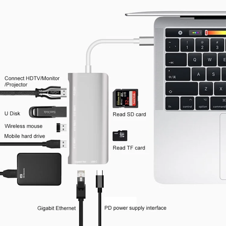 6. Interface: Type-C male x1, Type-C female x1, USB 3.0 female x3, HDMI female x1, RJ45 x1, SD slot x1, TF slot x1