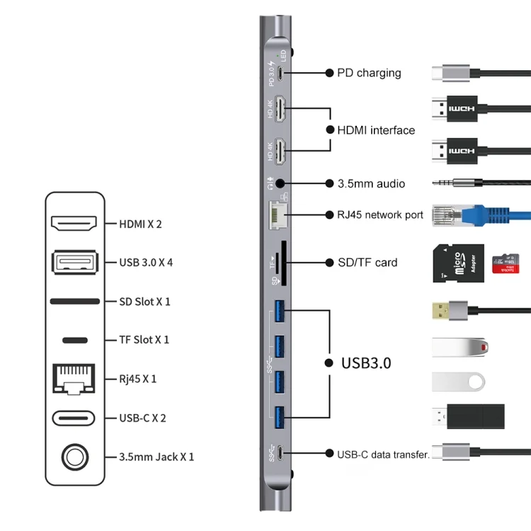 Onten 9199 12 in 1 USB-C / Type-C to USB-C / Type-C + TF / SD Card Slot + RJ45 + 3.5mm Audio + PD USB-C / Type-C Charging + 2 HDMI + 4 USB 3.0 Ports Multifunctional HUB Converter Docking Station