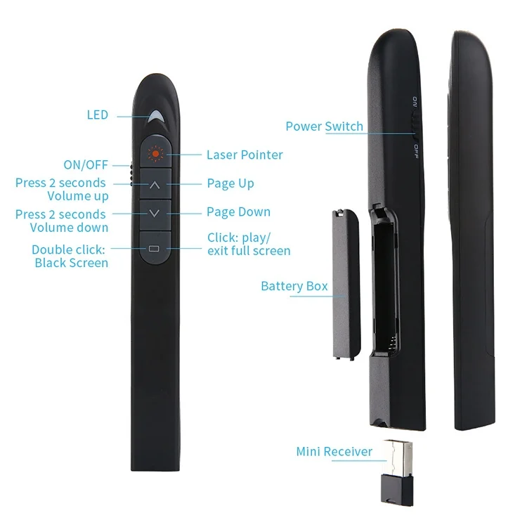 XM930 2.4GHz Wireless Laser PowerPoint Page Turning Pen Multimedia Wireless Presentation Projection Pen with USB Receiver, Support Low Battery Remind, Remote Control Distance: 100m