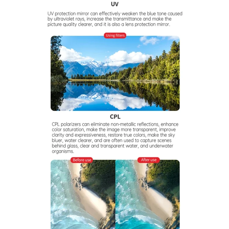2. HD professional optical glass, with high durability and scratch resistance, multi-layer nano-coating process, can ensure clear imaging, to meet the shooting process of high pixel imaging standards