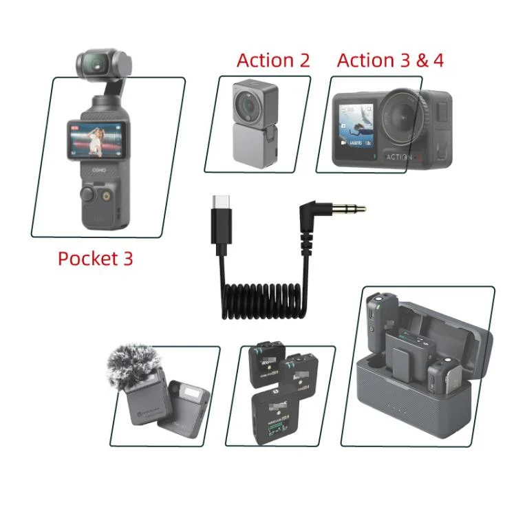 2. The USB-C plug is specially suitable for DJI Action 2/3/4 generation action cameras, and the other end is a 3.5mm standard audio head suitable for RODE Wireless series, DJI MIC, MOMA LARK, Relacart MiH, SONY Bee, etc.