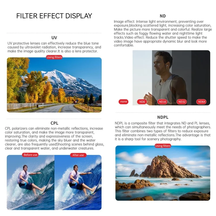 MCUV ,CPL ,ND8 ,ND16 ,ND32 ,ND64 ,ND1000 ,ND8PL ,ND16PL ,ND32PL ,ND64PL ,NIGHT ,STAR ,Streak Gold Drawing ,Streak Blue Drawing ,Macro 15X ,Pink Diving Filter ,Magenta Diving Filter ,Red Diving Filter ,3 in Color Diving Filter ,3 in 1 CPL ND8 ND16 ,4 in 1 UV CPL ND16 ND32 ,4 in 1 ND8-64PL ,6 in 1 ND8-64 UV CPL ,8 in 1 Filmmaking Kit |