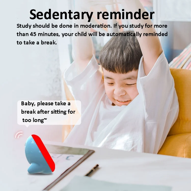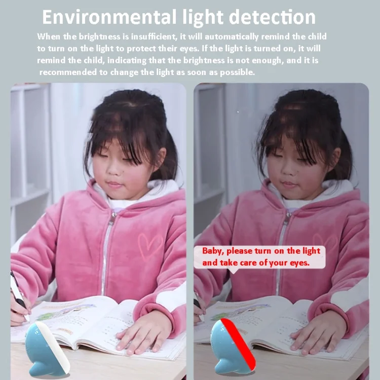 3. Ambient light detection: When the brightness is insufficient, it will automatically remind the child to turn on the light to protect their eyes. If the light is turned on, it will also remind the child, indicating that the brightness is not enough. It is recommended to change the light as soon as possible.