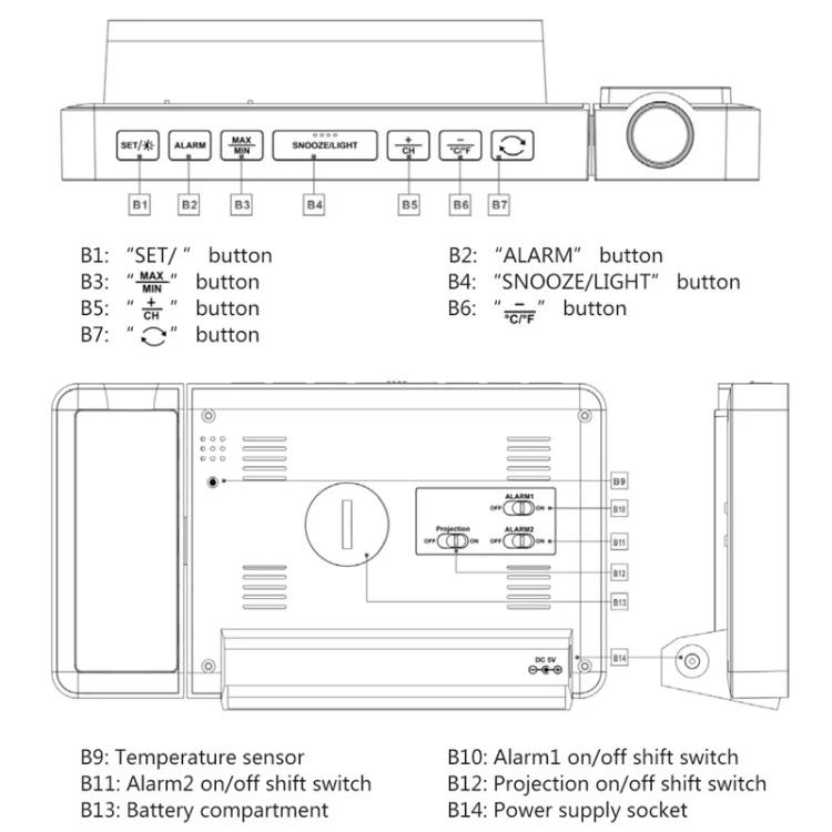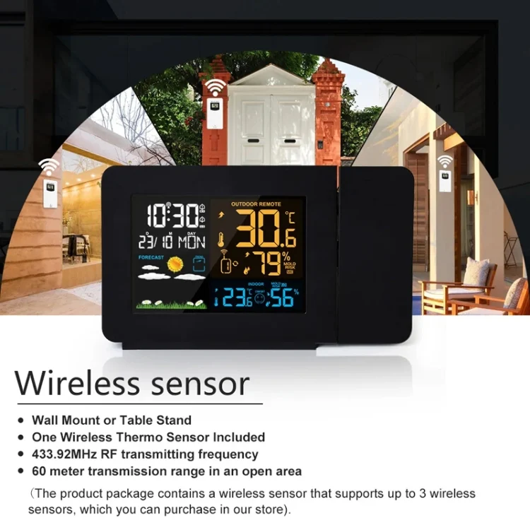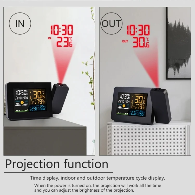 1. Projection function supports time and temperature projection at the same time, there is a switch to select the continuous projection or turn off the projection of indoor temperature + time and outdoor temperature + time rotating display