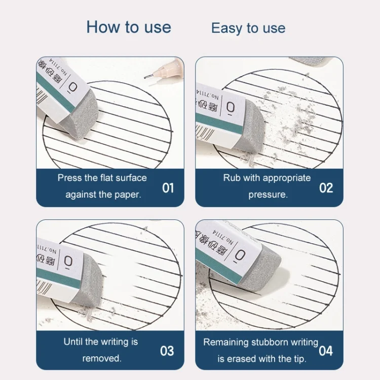 3. Principle: the eraser contains fine abrasive, by erasing the surface layer of the paper to take away the writing marks on the surface layer, to achieve the erasing effect