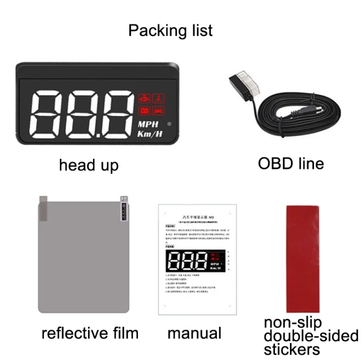 5. Packing list: head-up device x1, OBD cable x1, reflective film x1, 6. Instruction manual x1, non-slip double-sided sticker x1