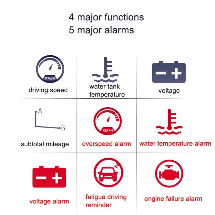 3. 4 major functions (driving speed/water tank water temperature/voltage/subtotal mileage), 5 major alarms (overspeed alarm/water temperature alarm/voltage alarm/fatigue driving reminder/engine failure alarm)