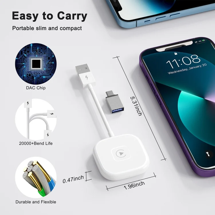 USB + USB-C / Type-C Wired to Wireless Carplay Adapter for iPhone
