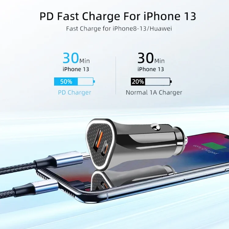 TE-P23 38W PD USB-C / Type-C + QC3. 0 USB Triangle Car Charger + USB-C / Type-C to 8 Pin Data Cable, Length: 1m