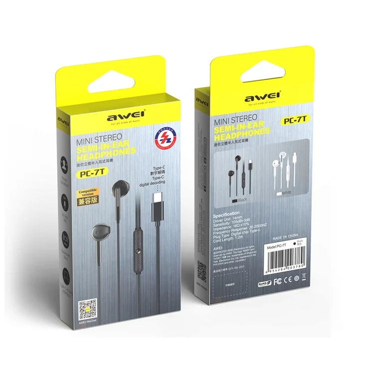 awei PC-7T Type-C Interface Mini Stereo In-Ear Wired Earphone, Length:1.2m, PC-7T(Black), PC-7T(White)