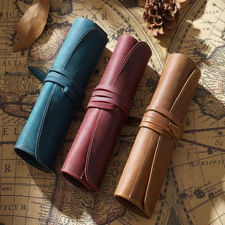 Retro First Layer Cowhide Pen Curtain Simple Literary Pencil Case Multifunctional Volume Pencil Case