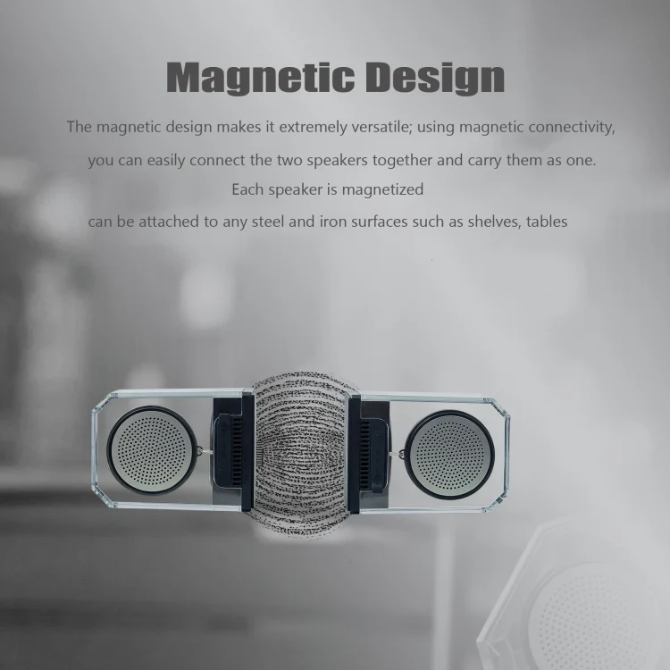 5.The magnetic design makes it extremely versatile; using magnetic connectivity, you can easily connect the two speakers together and carry them as one,Each speaker is magnetized and can be attached to any steel.