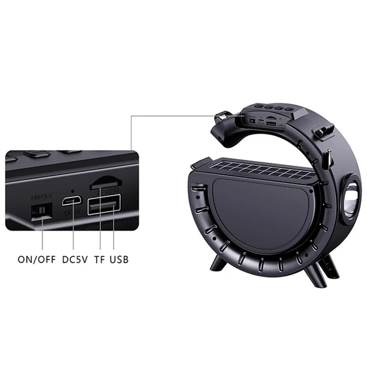 2. Main functions: FM radio, Bluetooth 5.3, TF/U disk playback, USB, flashlight, colorful atmosphere light, solar charging
