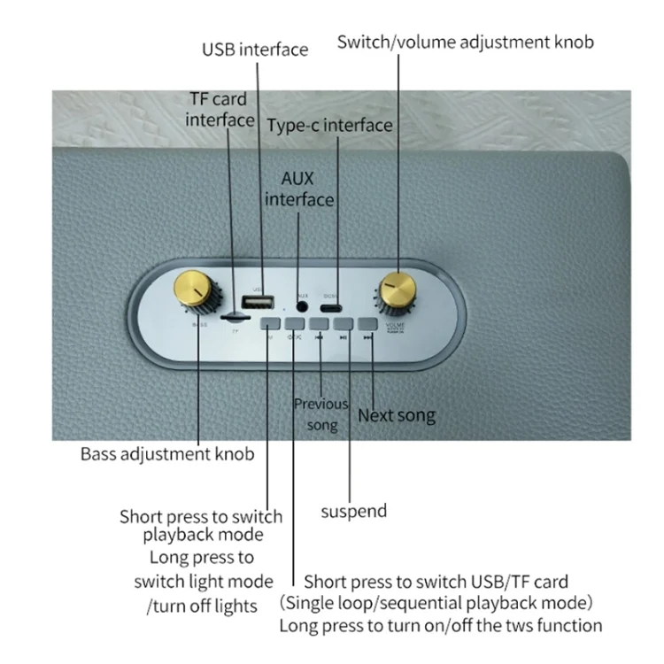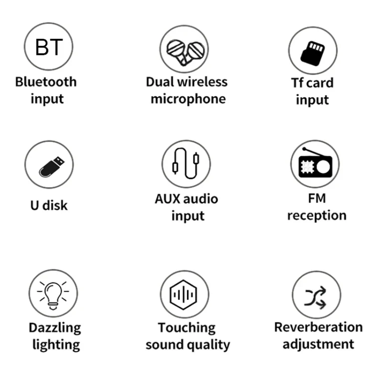 7. Playback mode: Bluetooth, TF card, U disk, audio input