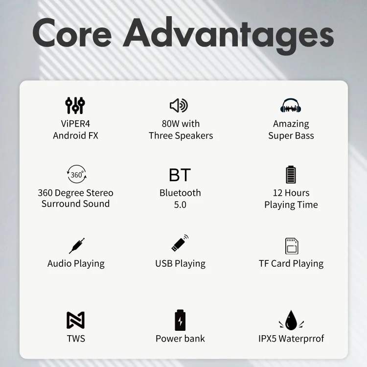 12. Connection method: Bluetooth / TF card / U disk / audio cable / TWS