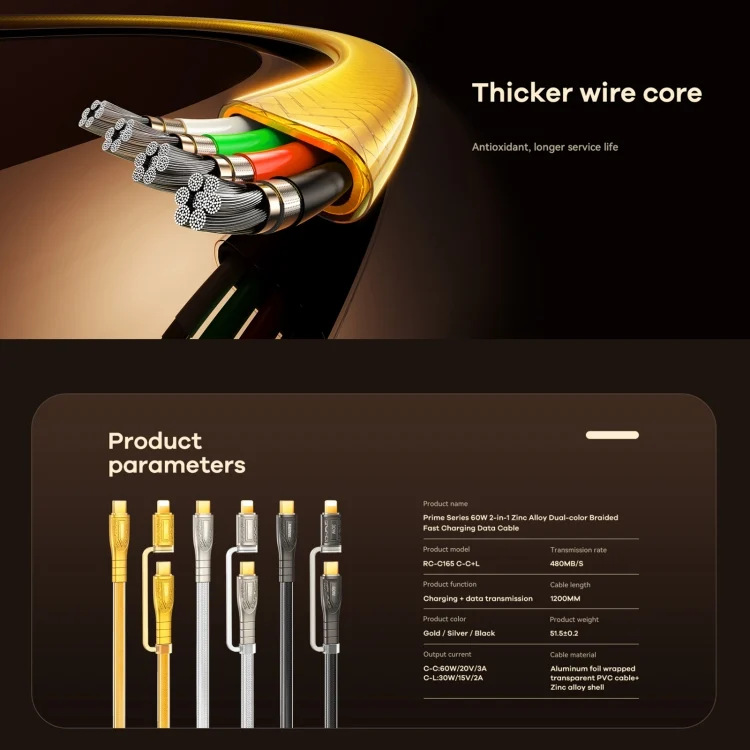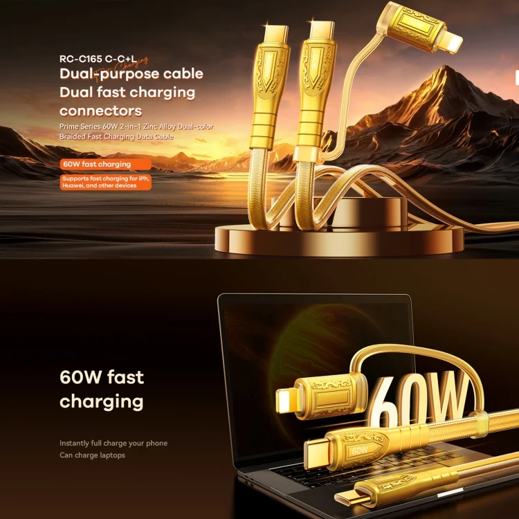 REMAX RC-C165 Prime 1.2m 60W Type-C to Type-C + 8 Pin Braided Fast Charging Cable, RC-C165