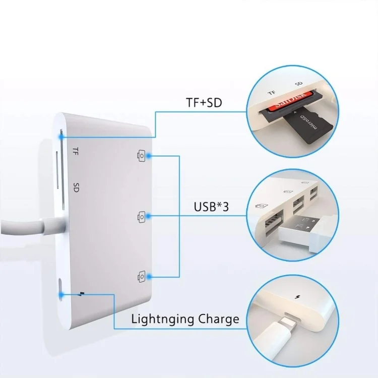 ZS-S1852 6 in 1 3 USB Female to 8 Pin Male OTG Camera Card Reader Adapter with SD & TF Card & 8 Pin Charging Interface, Support All iOS System