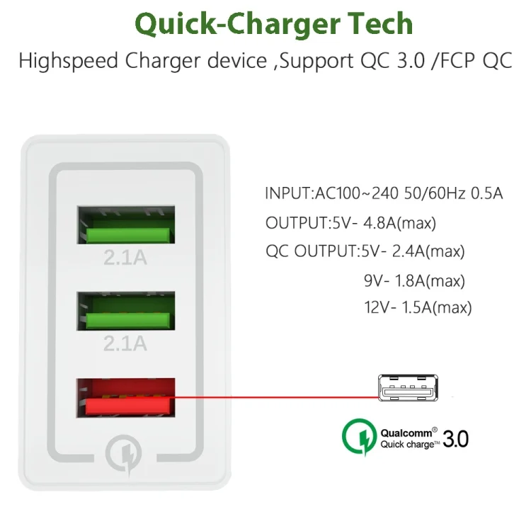 AR-QC-03 2.1A 3 USB Ports Quick Charger Travel Charger, US Plug, AR-QC-03 US, AR-QC-03 US Plug Blue