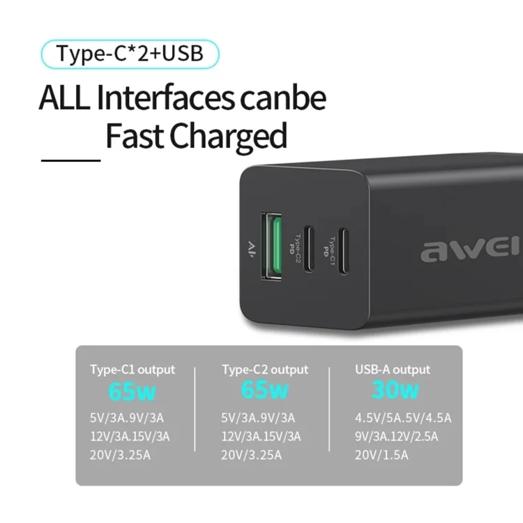 awei PD9 65W GaN Fast Charging Travel Charger, EU Plug