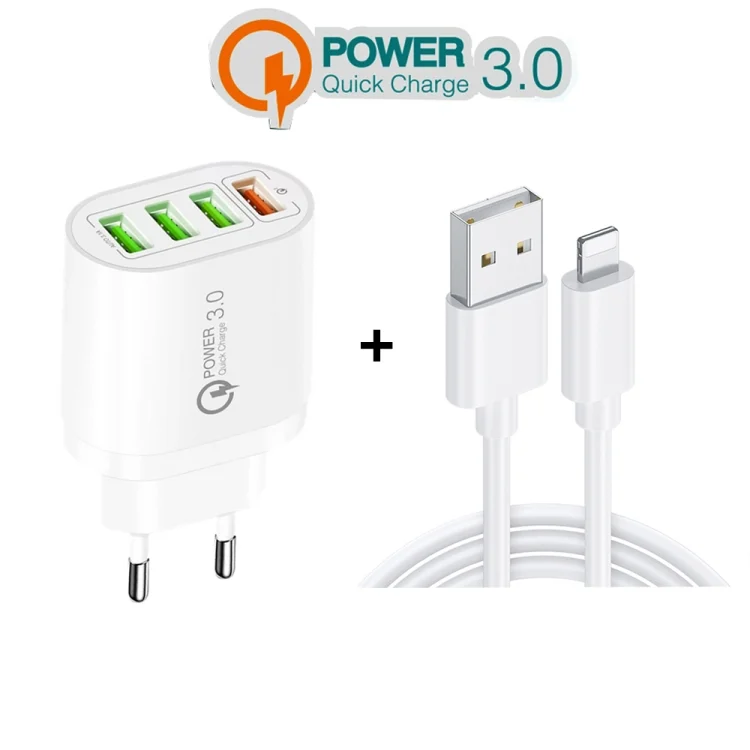 QC-04 QC3.0 + 3 x USB2.0 Multi-ports Charger with 3A USB to 8 Pin Data Cable, EU Plug, EU Plug + 8 Pin Cable