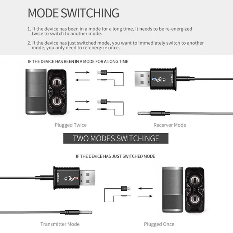 TX mode: Please connect the product to a device such as a TV with a 3.5mm audio cable/RCA audio cable, TX mode will automatically search for other Bluetooth receiving devices (such as Bluetooth headset, Bluetooth speaker, Bluetooth receiver, etc.), the red light flashes during pairing, and the red light stops flashing after pairing succeeds.
