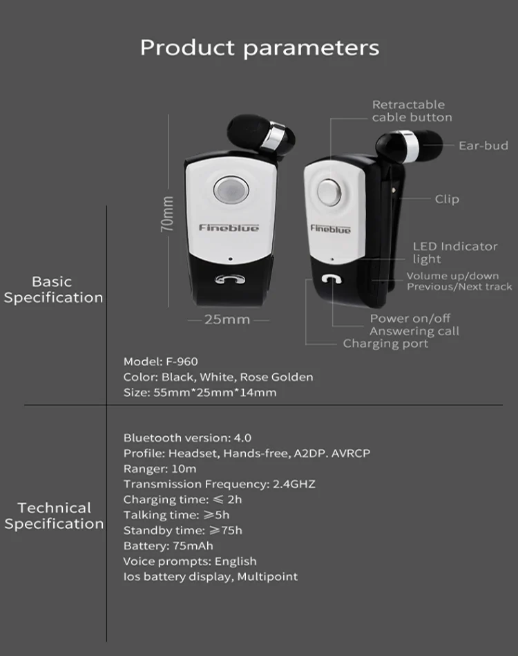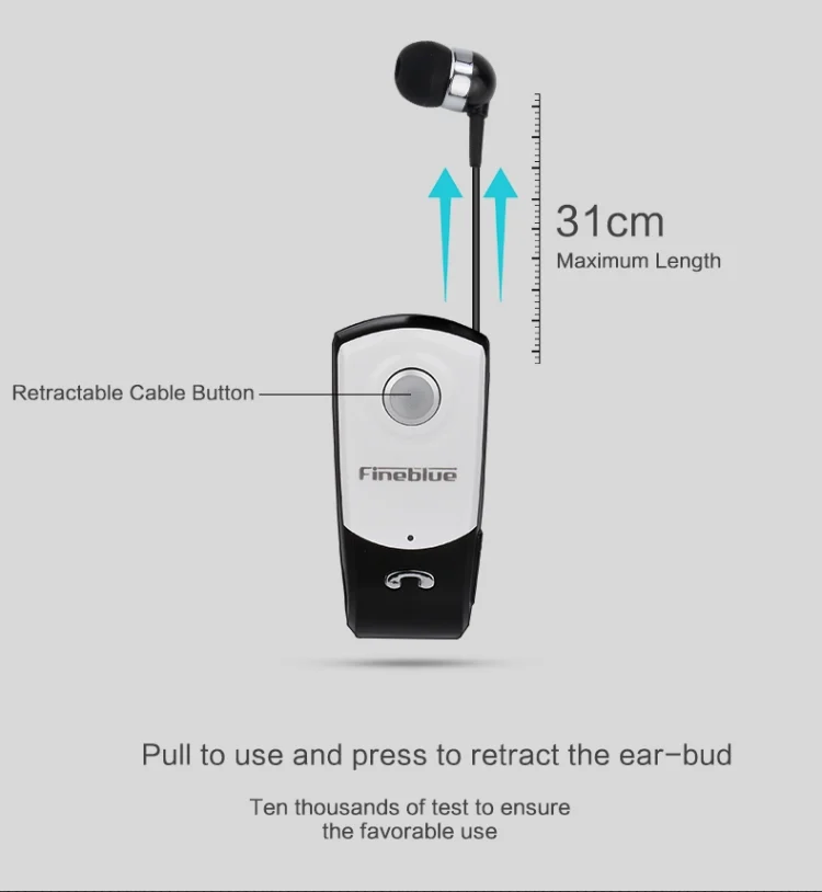 F960 CSR4.1 Retractable Cable Caller Vibration Reminder Anti-theft Bluetooth Headset, Black, White, Gold, Silver