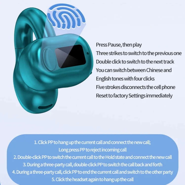 7. Features: digital display power, Chinese and English switch, caller ID, three-way call, TWS binaural function (requires 2 headphones), voice assistant, los power display, WeChat voice, music playback, etc.