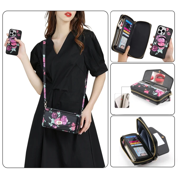 Flower Multi-functional Crossbody Zipper Wallet MagSafe Leather Phone Case, For iPhone 15 Pro Max, For iPhone 15 Pro, For iPhone 15 Plus, For iPhone 15