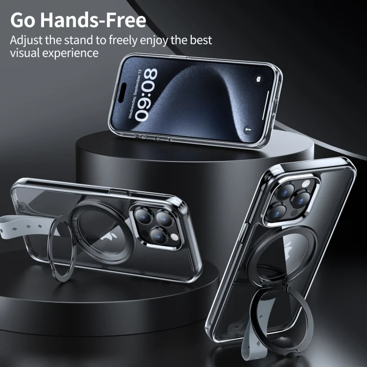 6. 360 Rotate Ring Stand: With a compact and practical design, we seamlessly combine powerful MagSafe tech with a foldable stand. The built-in kickstand effortlessly rotates 360 degrees and folds 120 degrees, giving you the ideal viewing angle for both landscape and portrait orientations. When folded, it seamlessly aligns with the back of the case, maintaining a slim profile for easy pocket-sliding.