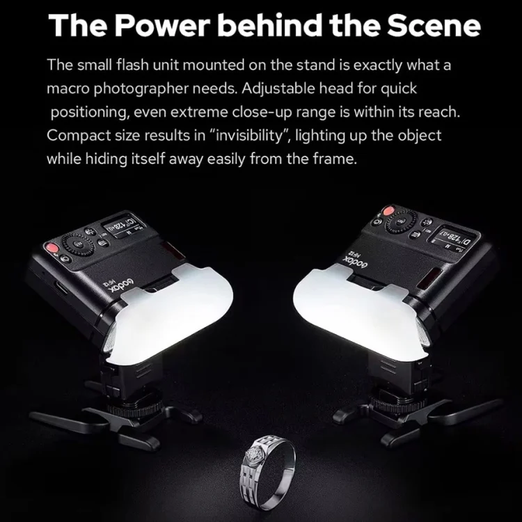 2. Compact Design: The MF12 Macro Flash is optimized for close-up photography due to its compact design and unique ability to be mounted directly to a lens via an optional adapter or placed around the subject with the included flash stand. Also, its size and wireless capabilities make it a good option for general photography as well.