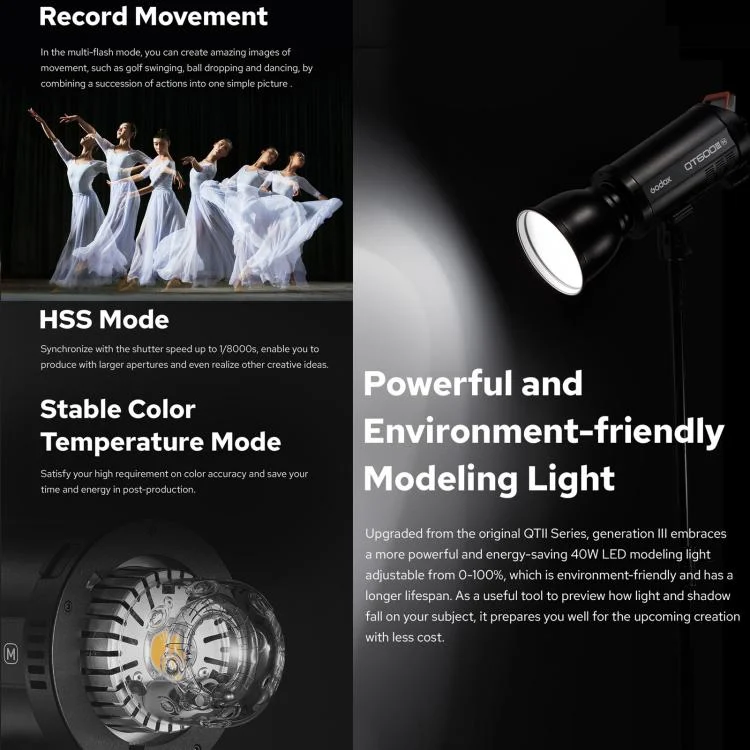 5. Powerful and Environment-friendly Modeling Light: Upgraded from the original QTII Series, generation III embraces a more powerful and energy-saving 40W LED modeling light adjustable from 0-100 percent, which is environment-friendly and has a longer lifespan. As a useful tool to preview how light and shadow fall on your subject, it prepares you well for the upcoming creation with less cost.