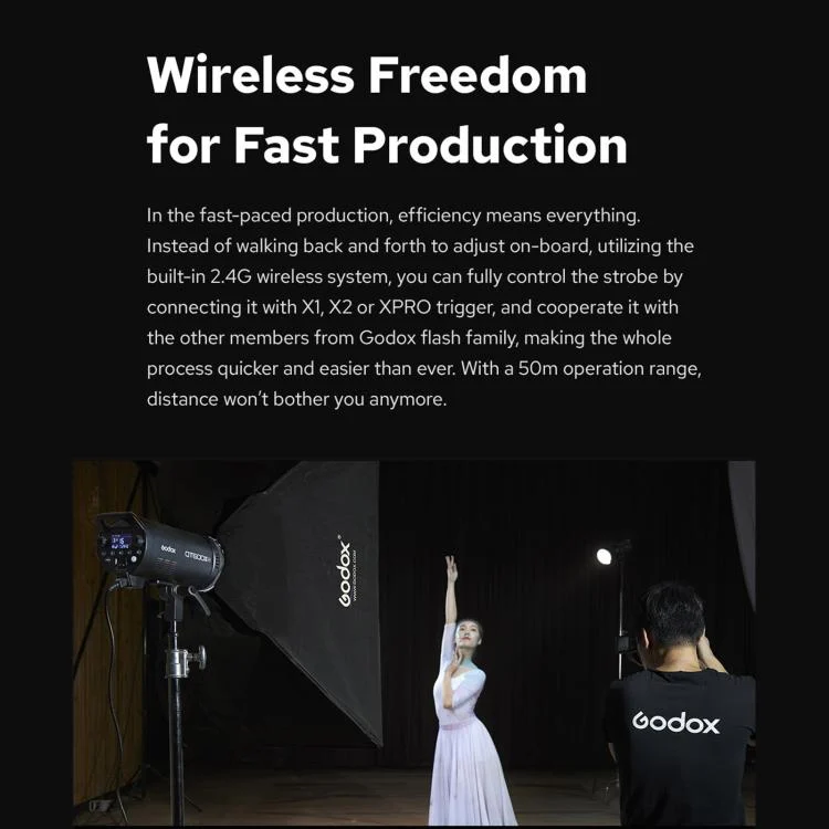 1. 2.4G Wireless System: In fast-paced production, efficiency means everything. Instead of walking back and forth to adjust onboard, utilizing the built-in 2.4G wireless system, you can fully control the strobe by connecting it with X1, X2, or XPRO trigger, and cooperating it with the other members from the Godox flash family. With a 50m operation range, distance wont bother you anymore
