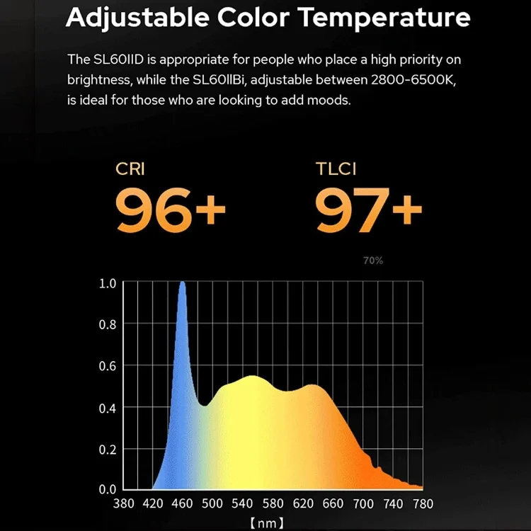 4. Adjustable Color Temperature: The SL60IID is appropriate for people who place a high priority on brightness, while the SL60llBi, adjustable between 2800-6500K, is ideal for those who are looking to add moods.