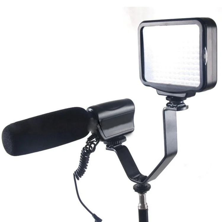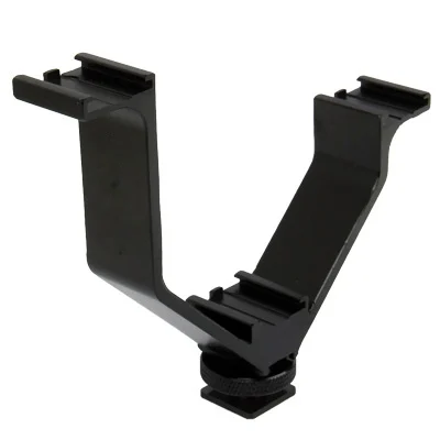 1) The triple shoe V-bracket mounts an a camera is accessory shoe to provide spaced mounting points for lights, monitors, microphones, or other accessories.