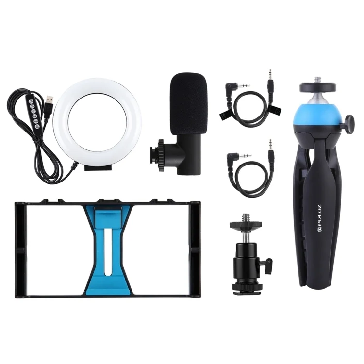 PULUZ 4 in 1 Vlogging Live Broadcast Smartphone Video Rig + 4.7 inch 12cm RGBW Ring LED Selfie Light + Microphone + Pocket Tripod Mount Kits with Cold Shoe Tripod Head