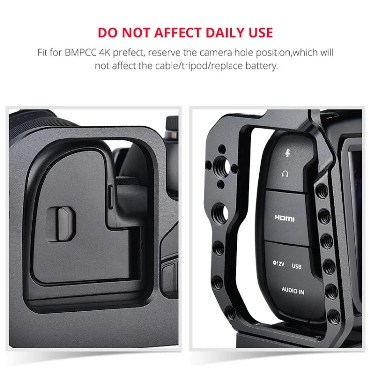 5. Perfectly fit for BMPCC 4k, and reserve the camera hole position, it will not affect the cable/tripod/replacement battery.