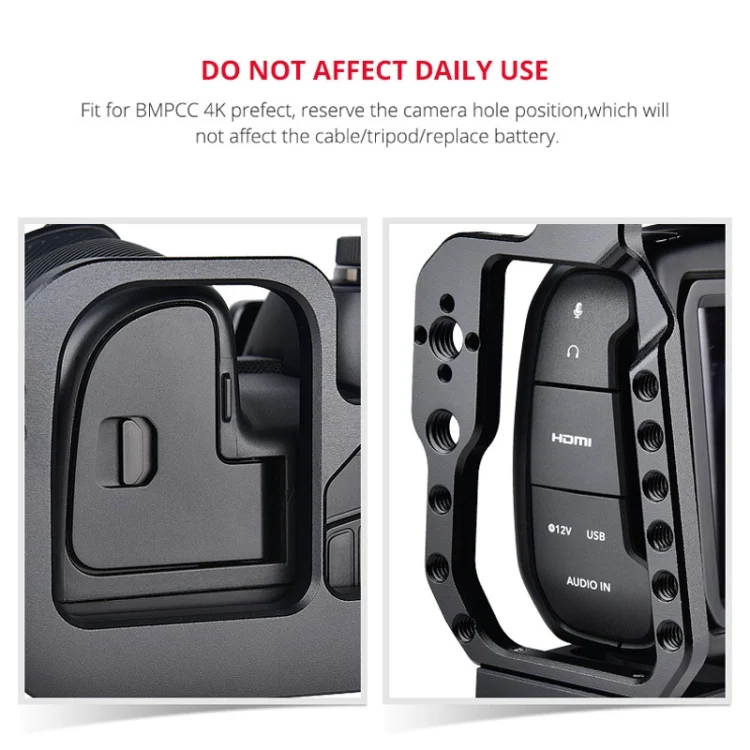 5. Perfectly fit for BMPCC 4k, and reserve the camera hole position, it will not affect the cable/tripod/replacement battery.