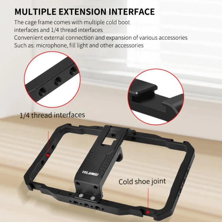 4. The cage frame comes with multiple cold shoes and 1/4 threaded interfaces, which are convenient for external connection and expansion of various accessories, such as microphones, fill lights and other accessories, making the expansion more abundant.