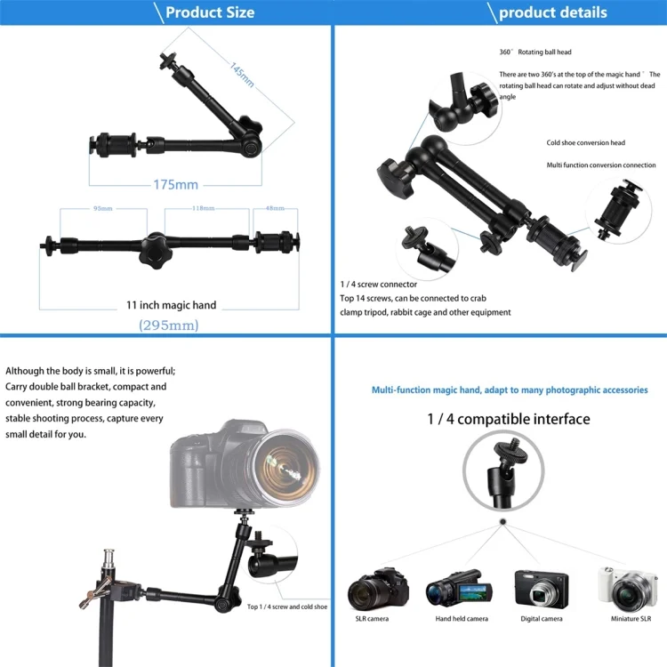 11 inch Adjustable Friction Articulating Magic Arm + Large Claws Clips with Phone Clamp