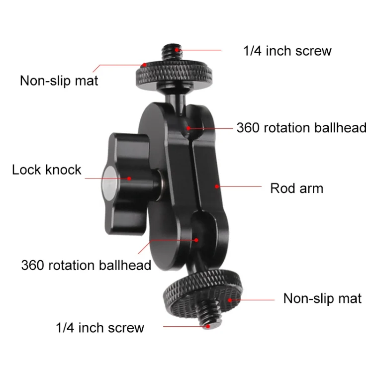 1. 360 degree rotating double ball head: The 360-degree rotating double ball head design can meet your shooting needs at any angle. The powerful magic arm on the double ball head can be firmly fixed on the surveillance camera, flash, LED auxiliary light, microphone, connected monitor, stabilizer.