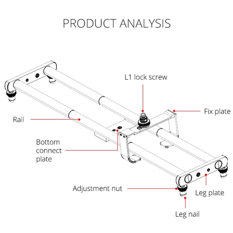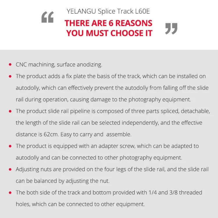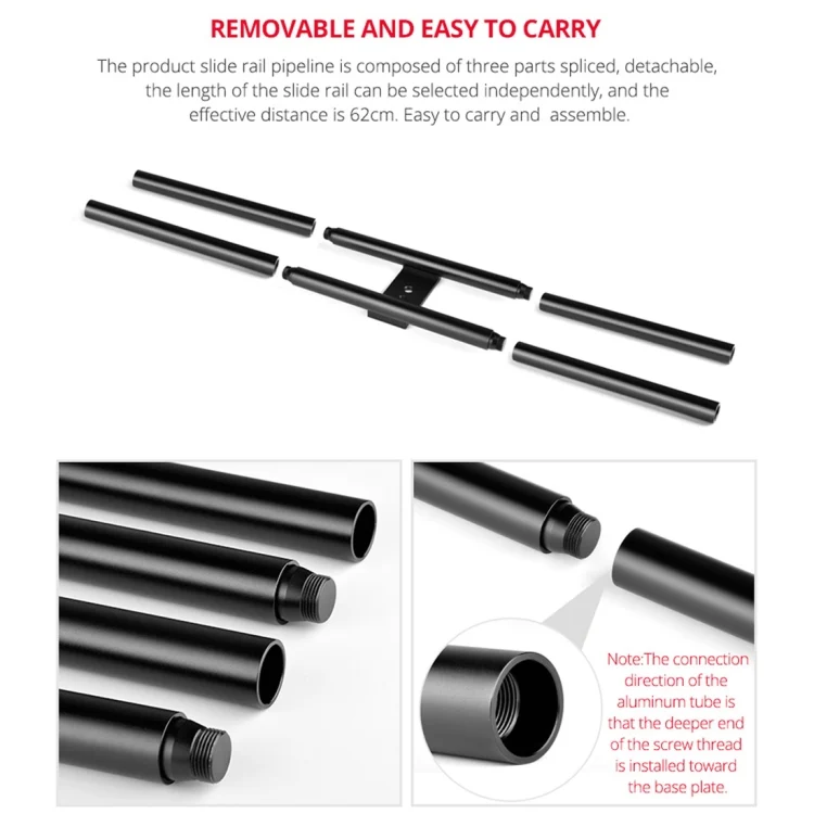 3. The product slide rail pipeline is composed of three parts spliced, detachable, the length of the slide rail can be selected independently, and the effective stroke is 62cm. Easy to carry and easy to assemble 4. The product is equipped with an adapter screw, which can be adapted to a camera cart and can be connected to other camera equipment
