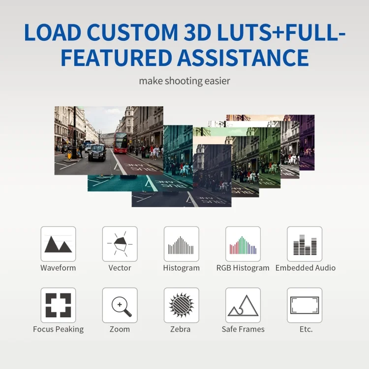 9. With Waveform, Vectorscope, RGB Histogram, Focus Assist, Monochrome etc. functions, can help you accurately exposure and focus every shot.