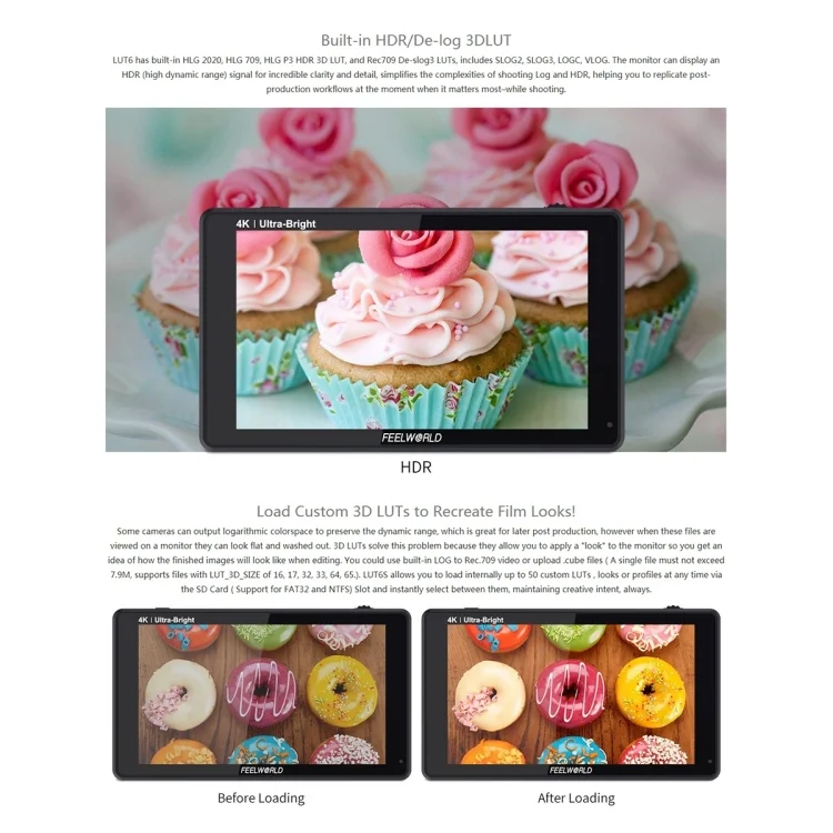 1. With a complete set of tools with simple operation and professional functions, all operations can be completed with one touch. Video assistance functions include focusing, composition and exposure tools (waveform, vector diagram, RGB histogram, brightness histogram, audio column, peak focus, zoom, zebra pattern, pseudo color, safety frame, etc.) and a flexible 3D LUT loading Tools (both 2. You can use the built-in LUT, or you can customize the upload of the .cube file), HDR monitoring and anamorphic widescreen recovery functions
